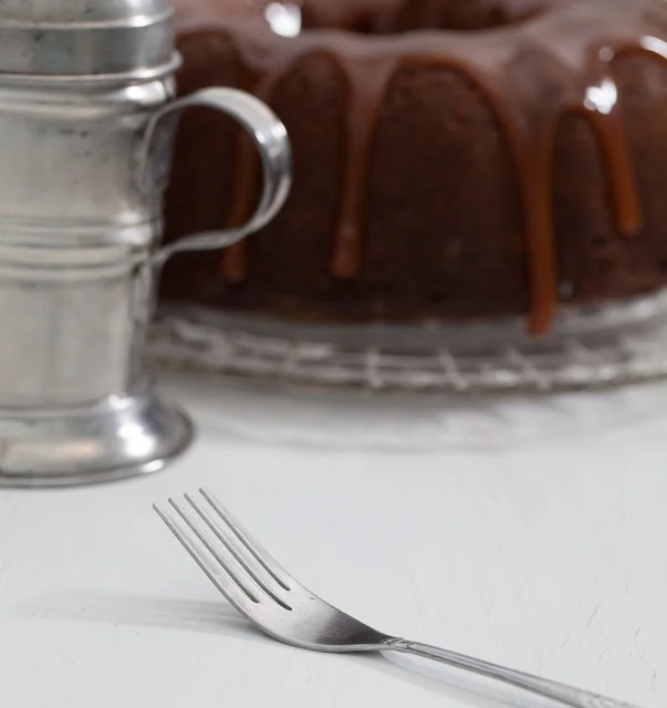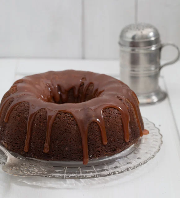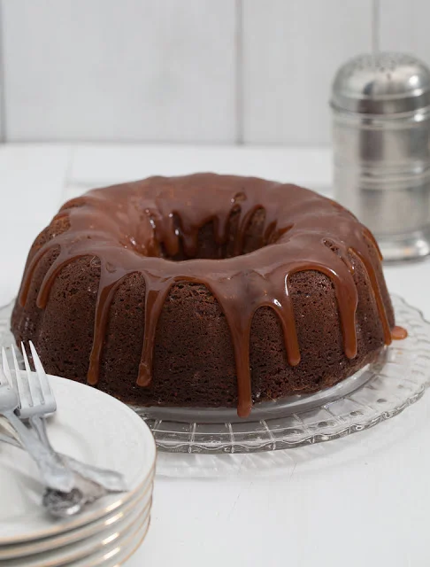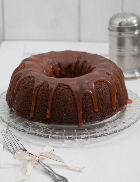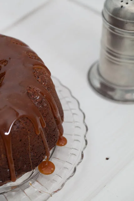 Dust cake lightly with powdered sugar. Drizzle caramel sauce over cake, allowing it to drip down sides and into grooves and crevices. Serve remaining sauce alongside.- To be fair here, I'll give you the heads up that since I photographed this cake, after I had dusted it with powdered sugar (which I did last), and made a few pictures, I decided I didn't like how it looked and brushed it all off. Personal preference really =)