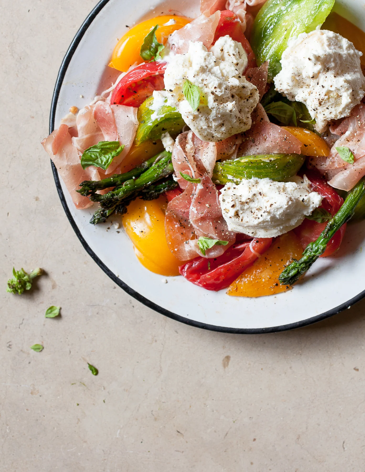 3: Plate by arranging a third of the grilled asparagus with a third of the Prosciutto and a third of the sliced tomatoes. Place 1 of the small whole Burrata’s on each place and sprinkle with Basil leaves. Top with salt and freshly cracked black pepper. Serves 3.